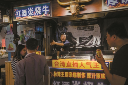 为了选定牛肉食材,王琛试了两个月。从网站上购入牛肉,从各大实体店买入,不断试吃,最后确定的是巴西牛肉。他的摊位上方,竖着一个大大的招牌——台湾正宗红酒炎烧牛,招牌中间是个金色牛头。给顾客递牛肉时,总是双手奉上。在摊位上,他喜欢与食客交朋友。手机里与食客的合照接近百张,他开始盘算怎样在自己的小店面里设置照片墙。
