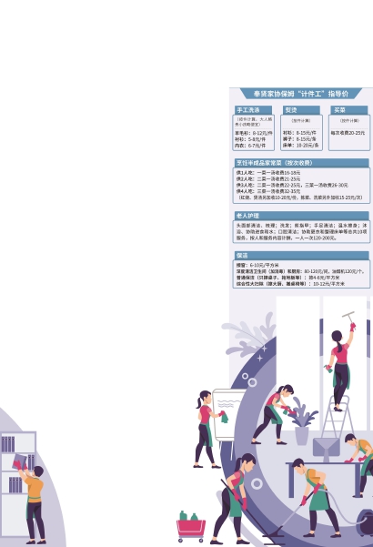 但由于“计件工”保姆是个新生事物,同样工作不同家政公司所给的薪酬不一样,而且差距较大,如何让使用“计件工”保姆的家政公司在支付薪酬时有一个参考依据,雇主又不用担心家政公司乱开价呢?本月,奉贤家协出台魔都首个保姆“计件工”指导价,指导价分手工洗涤、熨烫、买菜、烹饪家常菜、老人护理、保洁等6大类,让雇主和家政公司用工时心里有数。
