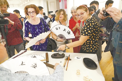 现场观众在一幅幅画作前仔细品评观赏。“这些画很别致,很优雅,我很喜欢!”出席开幕式的欧盟委员会教文总司文化多样性与文化创新政策官员莫妮卡·于里安这样评价。展览中,书法老师用毛笔现场书写的“上海”两个汉字的折扇,很受比利时朋友欢迎,大家拿着“上海扇”开心地合影留念。