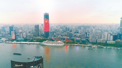 在落日余晖的映衬中,浦西第一高楼白玉兰广场主楼的LED荧幕上,滚动亮起五星红旗与“祖国我爱你”巨幅字样,与周边群楼亮起的五星红旗画面交相辉映。