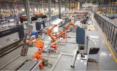 在久盛地板练市分公司强化地板生产车间,智能化改造已经完成。木材坯料从开槽机口进入,后通过传动辊台输送到自动化锯切线、封蜡线、包装线等,最后包装完毕的强化板成品,由橙色机械臂整齐堆放。这期间,大部分工序都由机器人完成。