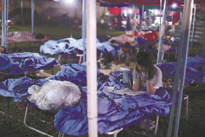 据四川文明网报道,6月18日晚9点多,长宁县双河镇双河中学操场的安置点,雨滴落在帐篷上发出清脆的响声,帐篷内有的人在相互聊着天,有的年轻人打开手机放着歌,有的孩子已经依偎在母亲身边安然入睡。一个女孩坐在行军床上,膝盖上放着打开的一本文言文,内页上显示着《桃花源记》。她认真抄写着内页里的每一句话,尽管身边发出各种声音,女孩儿却丝毫没有受到影响。
