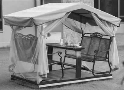 更有兴致极好者买来摇摇椅,坐在摇椅上晃悠晃悠,小伙伴们更加乐在其中了。如图所示的这种摇椅,四张座椅一张桌子,摇椅重量是110公斤,板材都是加粗加厚的,承重500公斤,可以抵抗6级风力,顶布是防雨防晒的涤纶布,能防紫外线穿透,织物紧密耐磨性好,布料耐脏易清理,抗撕力强结非常实耐用的。想必你见到这种摇椅后也一定很喜欢。上有布棚遮阳,烈日当空不怕。旁有纱帘防蚊,夏日里尽管蚊子猖獗也不怕。