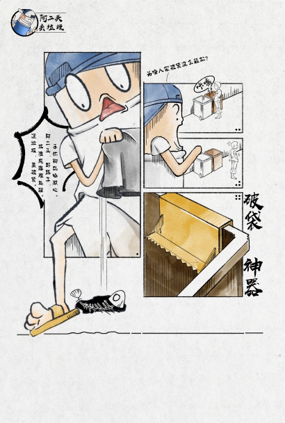 他发现虽然垃圾袋里面的垃圾都是湿垃圾,可偏偏垃圾袋是干垃圾,他需要把垃圾袋和垃圾进行分离。