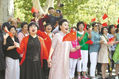 “我和我的祖国,一刻也不能分割……”熟悉的旋律从轻快的长笛、浑厚的单簧管中跳跃而出,市第三女子中学吹奏乐团的学生们各执乐器出现在园内上海凝聚力工程博物馆前。随着《我和我的祖国》乐曲的推进,人们越聚越多,手里挥舞着国旗。这座见证长宁变迁、浓缩时代记忆的博物馆,逐渐成为红色的海洋。