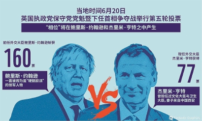 英国首相职位之争进入最后阶段。上周,英国保守党议员投票选出了最后两位党首候选人——前外交大臣鲍里斯·约翰逊和现任外交大臣杰里米·亨特。由于保守党是目前英国的执政党,谁当党首意味着谁将接替特雷莎·梅成为新一届英国首相。