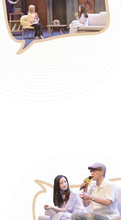 长裙,帆布鞋,倪妮舒舒服服地在沙发上一坐,和大家聊天,没有明星光环,是个自在洒脱的邻家姐姐。当天见面会的观众非常多,坐满了整个剧场。