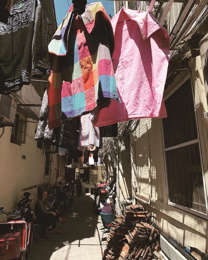 弄堂里因地制宜,晾晒着各种鞋袜被单。我们指着一床国民被单问:“这个用了多少年啦?”