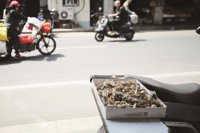 店门口,一只装满笋干的纸盒,搁在黑色电瓶车上。颜色略显暗黄的春笋被削成了条形,在阳光的照晒下,笋的表面微微皱起,让人垂涎欲滴。