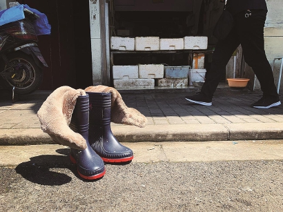 “惠民水产店”门口,一双黑面红底的套鞋翻出抓绒内胆,就像是兔子耷拉着的长耳朵,晾晒在太阳底下。