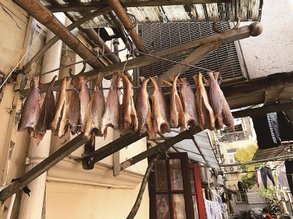 一排架在晾衣架上的小黄鱼,成功地引起了我们的注意。