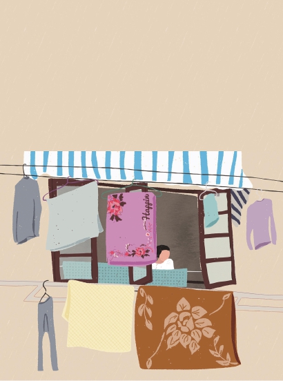 我们和水产店老板闲聊着,头顶突然伸出一床粉红色的“国民被单”。