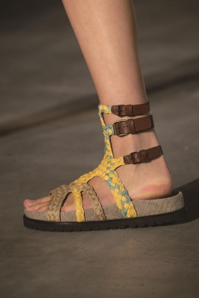 Esp ad rilles目前还算是草编鞋中的主流,像M ichael Kors、To ry Bu rch今年春夏系列中就都有草编鞋底的sandals。不过也有大胆创新“反其道行之”的,比如Stella M cCartney。在推出了星星厚底鞋之后,Stella M cCartney好像就没有什么特别爆款的新鞋,不过今年春夏T台上的一款草编鞋倒是很引人注意:硬质的藤草以波浪形组合排列的方式被外力固定在一起,薄底尖头看着足够时髦。不过大概是穿着舒适度上出现了问题,从街拍上来看,这双草编鞋虽然好看但是曝光率并不高。