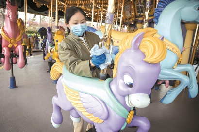 演职人员仔细擦拭旋转木马把手、休息长椅等每一处游客可能会接触的部位,重点部位用消毒液进行消毒。乐园门口的排队通道处等客流可能聚集的地方,地面上都贴上了“请勿在此停留”等标识。