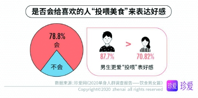 唯有爱与美食不可辜负,那么爱与美食究竟有何关联?调查显示,近八成(78.8%)单身男女会通过给喜欢的人买好吃的来表达好感,且男生(87.70%)比女生(70.82%)更乐意买好吃的来表达好感。“投喂美食”很多时候不仅仅是分享食物,更是对他人关心、疼爱的一种表达。