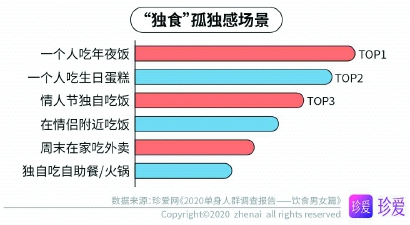 此外,不同的情况下“独食”也有着不同程度的孤独感。调查显示,一个人吃年夜饭、吃生日蛋糕、情人节独自吃饭、在情侣附近吃饭、周末在家吃外卖以及独自吃自助餐/火锅也是孤独感高峰时刻。