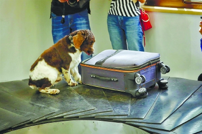 “嗅!”随着训导民警一声令下,史宾格犬“皮蛋”跳上模拟的机场行李传送带,一包毒品海洛因在此前已被随机放进其中一个拉杆箱中,“皮蛋”迅速在传送带上的7个行李箱中来回嗅探。