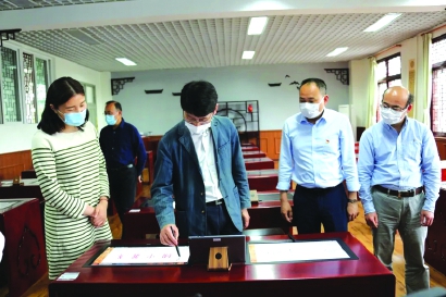 调研组一行走进校园,就立刻询问临时留观区、教室、职工餐厅等重要场所及关键点位,关心学校在疫情防控及复学工作中的重点难点问题。随后来到书法创新教室,了解一中书法教育“创艺工坊”项目的推进工作。一中作为上海市书法特色学校,书香文化亦是校园文化之一。在书法教室中,王一力副主席饶有兴致地体验了用触屏笔在平板上书写汉字。通过现场体验,听取介绍,王一力副主席对一中书法特色课程以及运用信息技术融合课堂教学的创新探索表示肯定与赞赏,并希望浦江一中要巩固成果,不断开创课堂教学改革与创新、全面提升学生素养的新局面。
