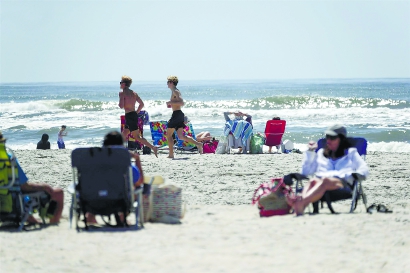 在马里兰州大洋城,步行街上人头攒动,多数没有遵从卫生部门建议戴口罩。