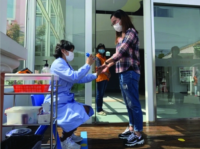 在入园晨检环节,园部在大门外设立了家长排队等候指示牌,地面清楚标识了一米排队线,供幼儿和家长有序排队,另有门卫保安在一旁协助维持秩序。大门口处,家长向老师出示健康随申码,测量体温,然后将携带的幼儿被子交给门口的志愿者。由志愿者放入对应班级箱子内,严格做到外来人员不进入幼儿园。幼儿在测量体温后自行刷卡入园,到洗手池处有序排队洗手,洗手完毕的幼儿根据地上的标识分流到大厅两端进行晨检,随后入园。