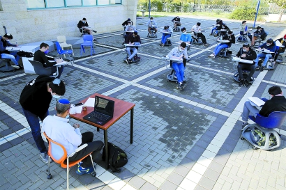 据新华社报道 11月29日,佩戴口罩的高中生在以色列莫迪因一所重新开放的高中校园学习。根据以色列政府的批准,发病率较低的“绿色”或“黄色”城市的高中校园自29日起重新开放。
