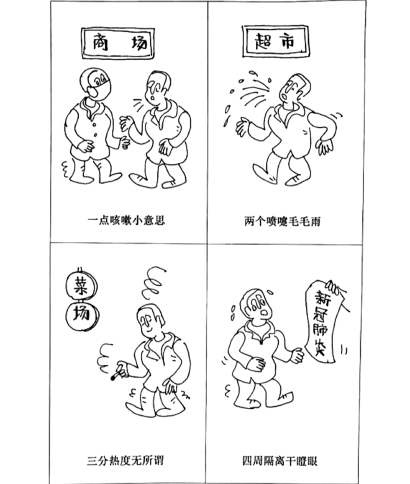 《别来无恙》是单幅漫画,用“访客上门、主人婉拒”的画面提醒大家,疫情高峰不要串门,避免传染。《一二三四诊断书》则用四格漫画描绘了疫情期间,出门如果不注意防护,很可能会染上病毒。