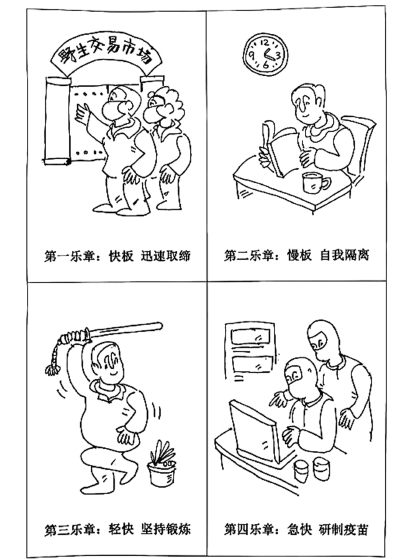 四格漫画布局犹如一幅画卷,以逻辑线串联缓缓展开,抛出问题,平面展开,突出矛盾,制造主题高潮。比如四格漫画《攻克疫情交响曲》,第一幅《第一乐章:快板,迅速取缔》抛出问题所在,第二幅《第二乐章:慢板,自我隔离》平面展开问题,第三幅《第三乐章:轻快,坚持锻炼》突出问题矛盾,第四幅《第四乐章:急快,研制疫苗》营造整篇高潮。此外,四格漫画也可以采用四焦点并联、并行展示的方法,共同烘托主题。