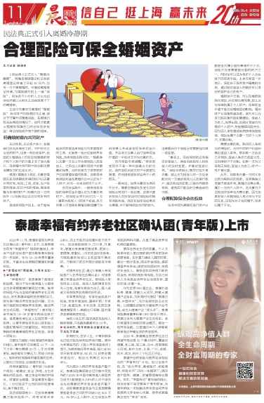 2020年11月,泰康幸福有约养老社区确认函(青年版)上市,这是泰康在现有“幸福有约”版图的基础上,将该产品的目标客户更加聚焦青年群体的一次创新,专为19-39岁青年量身定制,丰富全生命周期的健康和财富规划。