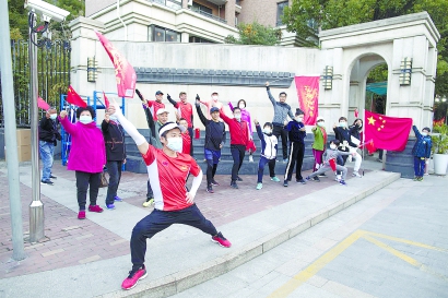 一人手里拿一面国旗,王四甫在队首,十来个人就这样跑出了小区,围着小区跑了起来。这条路,对王四甫来说,很熟悉也很陌生。说它熟悉,是因为这条路,他常常带着两个闺女连跑带走,一圈差不多3公里;说它陌生,是因为这条路,他已经14天没有脚踏实地地踩过了。