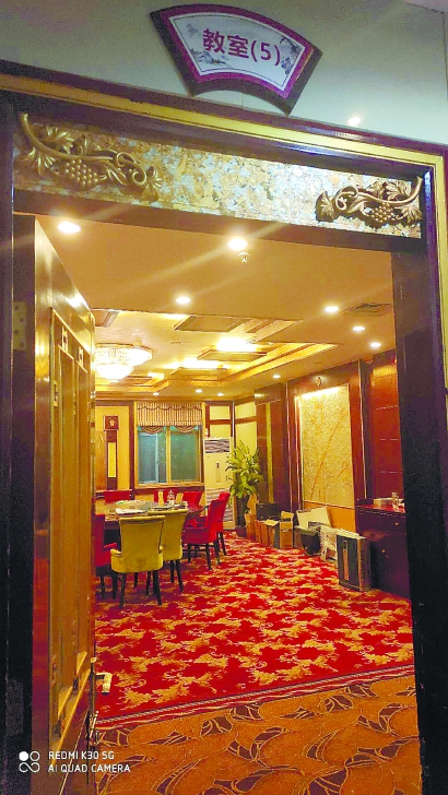 后来,有学生在网上查到,在“浦校”入驻之前,青青旅游大世界便已处于半废弃状态多年。更令学生们惊讶的是,目前上课的这片区域,也不完全属于“浦校”。学生们发现,上课期间,酒店还会同时被租用给企业做为培训场地,他们不得不一边围着酒店大堂内的圆桌子上晚自习,一边忍受着隔壁飘来的阵阵菜香。