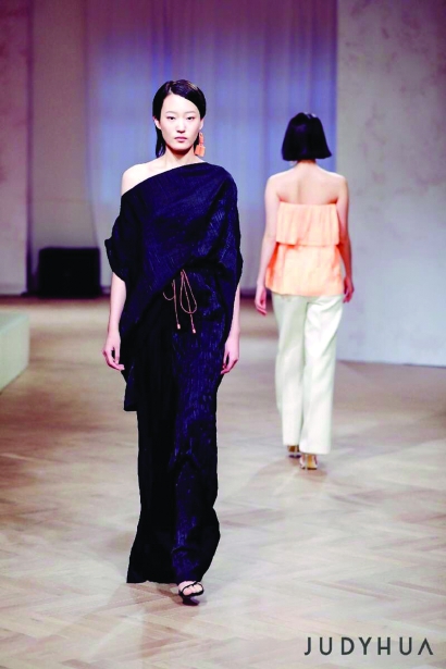 在宛如外科手术刀一般犀利的剪裁之下,华娟以建筑师的思维架构了整个系列的框架与空间感,使得整个系列充满张力又兼具柔和。隐喻出世的朴素的皱褶面料,辅以极简纯粹的现代设计,以常玉油画中的粉橘、乳白呈现,让人联想到当代女性坚强之中的柔韧。女人胴体以涂鸦和编织等不同工艺,在不同材质和肌理的面料上实现,虚实结合,工笔与写意融汇,充满诗意。