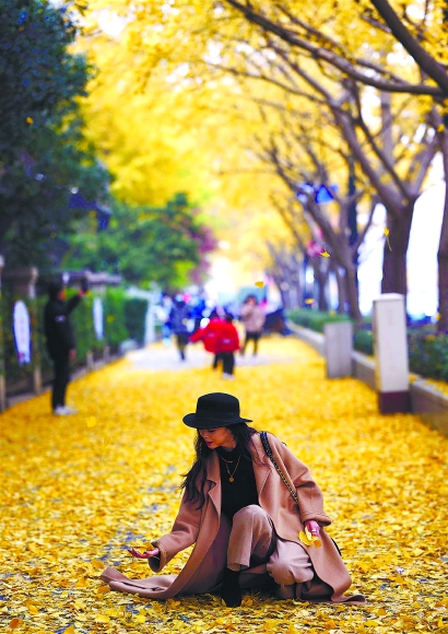 申城昨天刮起大风,四平路两旁银杏树的叶子纷纷落下,人行道上仿佛铺了一层“金色地毯”。 /晨报首席记者 任国强