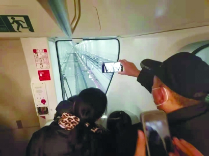 18号线全自动无人驾驶列车不设驾驶室。当天,乘客从车头的车窗望出去,可以看到隧道内的景致,很多乘客来到车头位置一饱眼福。“哇,这个车头将成为下一个‘网红’打卡地!”