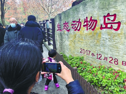 进入动物岛,各动物笼舍前都围了不少游客,入口处的香猪肥肥壮壮,深受小朋友喜爱。生态动物岛的石碑前亦有不少游客合影留念。