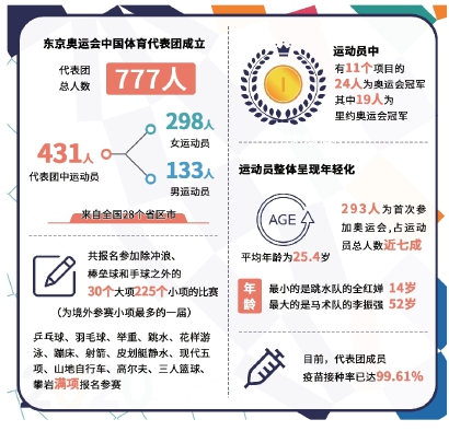 14日,东京奥运会中国体育代表团在北京成立,代表团总人数为777人,是中国体育代表团境外参赛规模最大的一届奥运会。
