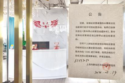 记者在“女士秀会员工作室”门口看到,目前,该店已经停止营业,大门紧闭。门上张贴的公告显示,经查,该地址经营者擅自从事依法应当取得行政许可证的经营活动,静安区市场监督管理局已经依法送达《责令停止经营活动通知书》,责令该地址经营者应当立即停止违法经营活动。