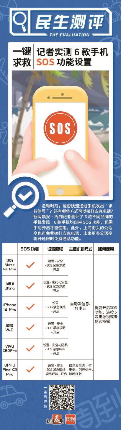 危难时刻,能否快速通过手机发出“求救信号”?还有哪些方式可以拨打应急电话?7月23日,记者测评了6款不同品牌的手机发现,6款手机均自带SOS功能,但需手动开启才能使用。此外,上海街头的公话亭也可免费拨打应急电话,未来更多公话亭将开通限时免费通话功能。