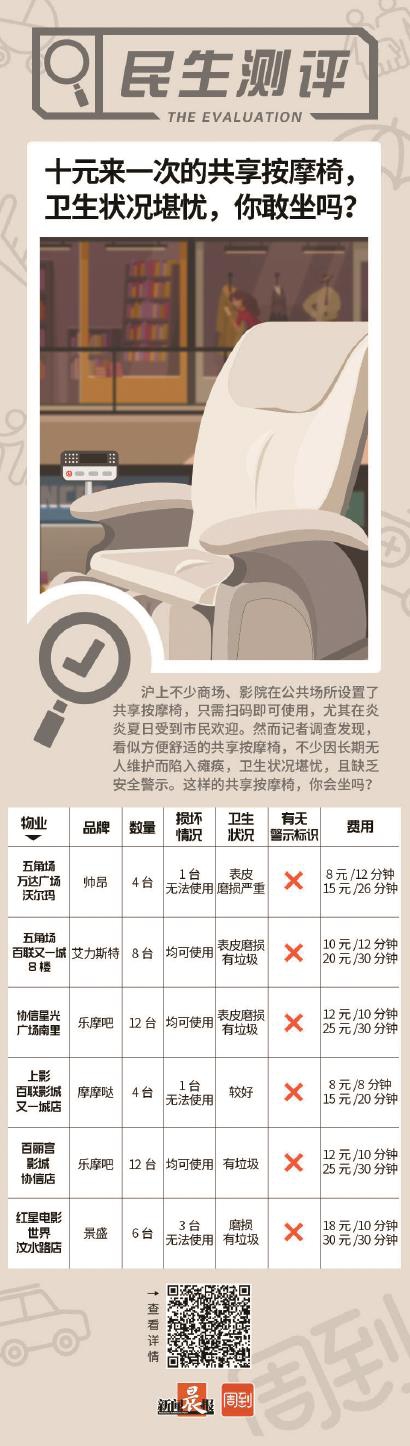 目前遍布全市各大场所的共享按摩椅,真的能为市民提供物美价廉的按摩服务吗?记者分别对本市3家电影院和3家商场的共享按摩椅进行了全面测评,发现看似方便舒适的共享按摩椅,实际上却存在着无人维护、卫生状况堪忧以及缺乏安全警示等诸多隐患。这样的共享按摩椅,你敢坐吗?
