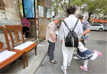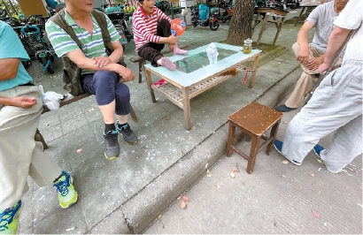 傍晚的时候我们经过一个门洞,看到十几个阿姨爷叔喜气洋洋地齐齐坐在小板凳上。