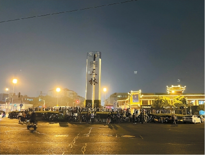 白天空无一人的平台,此刻变身为一个圆形舞台。人们绕着这个360度看得到“三林”大字的立碑跳着交谊舞。