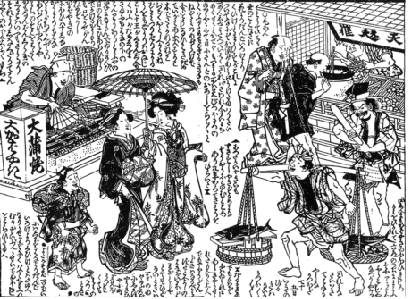 好一个“鲜花比不上团子,色欲比不上食欲”。两百多年前,江户已经发展成为一个人口数量超过一百万的大都市,饮食业提供的食品可谓是琳琅满目。仅刚才引用的这段文字里面,就有鸭肉荞麦面、天妇罗、蒲烧、白玉年糕红豆汤、魔芋关东煮、大福饼、烤白薯、卷寿司、烤鱿鱼干、菖蒲团子、荞麦面等等。