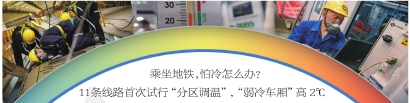 地铁空调调温师会随时登车,实测车厢温度,根据早、晚高峰、客流低谷等时段客流特点,进一步修正空调温度,尽量将车厢内的温度维持在舒适区域。由于部分老式列车,司机无法在司机室直接进行温度调控,需“调温师”在每节车厢单独调节。