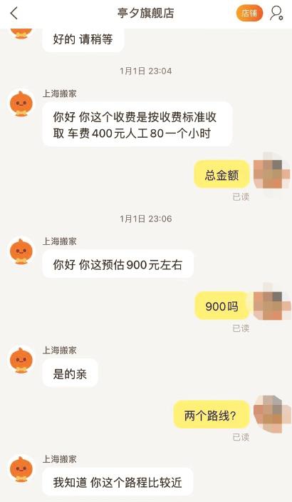 今年年初,家住徐汇区的路先生抱着对天猫平台的信任,在天猫APP搜索搬家服务,找到了一家“亭夕旗舰店”沟通搬家事宜。路先生对旗舰店客服提出需要一辆厢式货车,分别在两处地点搬运一些物品,最后一起搬至第三处地点,总路程不超过3公里,且三处地点都有电梯。