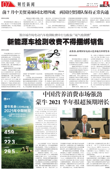 中国营养消费市场强劲 蒙牛2021半年报超预期增长