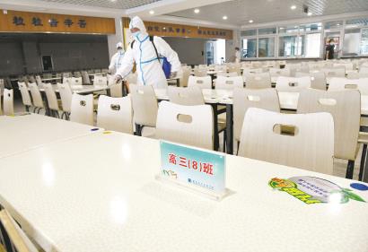 开学第一课:疫情防控记心间。8月29日,青岛通济实验学校校工在学生食堂内消毒。 /新华社