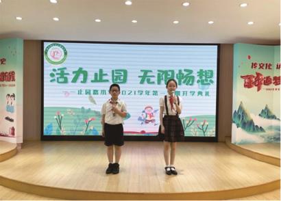 金色的九月向我们招手,美丽的校园向我们敞开怀抱。9月1日上午,2021学年第一学期“活力止园 无限畅想”开学典礼举行。四(2)班孙薇翎和三(3)班叶灵同学作为新学期的升旗手上台演讲,展现了新时代少年积极向上的良好风貌。李易轩和杨逸蕊作为小主持,分享了暑假里的所学、所看、所感。