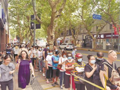 在光明邨大酒家淮海中路总店,购买鲜肉月饼的队伍在人行道上绵延几十米,几乎要延伸到成都南路路口,站在前端一眼望不到队伍尽头,旁边还有一名警察帮忙维持秩序。