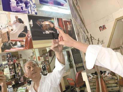 他用手指轻抚过这些照片:“回头要把它们都拿下来,带回家去收藏。”这些照片里,有他自己的一张剧照。也是2015年的时候,他在一部以上世纪90年代上海人出国潮为背景的电影《纽约纽约》里本色出演了一个剃头师傅。电影中有一幕就在和平美发厅取景:苗侨伟演的美籍华人米先生和阮经天演的酒店领班路途在理发时偶遇。米先生指着王登楼演的廖师傅对路途说:“来上海,一定要找廖师傅。”廖师傅笑应:“是米先生照顾我,路途你先坐。”镜头转到理发椅上,廖师傅为路途兜上围布,用扬州话熟溜蹦出一串对白:“他现在不得了,到美国去了,做大老板了。每趟家来了,还是找我给他剃头。他不相信人家。”
