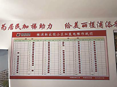 槎浦新家园专项加梯工作室可以算得上是其中一个典型。工作室由槎浦新家园与徐虎加梯工作室人员共同组建。工作室外的门窗上,张贴着多张加梯海报,营造了浓厚的宣传氛围。进入室内,硕大的小区加装电梯作战图映入眼帘,清晰地反映出当前加梯工作的实时进度。作战图旁,张贴着两套不同加梯方案的效果图。对面一侧的墙上,小区的加梯地图以不同颜色的色块将所有楼栋按照难度进行划分,十分醒目。同时,重点楼道加梯工作架构图、槎浦新家园加梯工作小组名单等信息一目了然,整个办公场所采取“可视化”模式,所有信息均“透明化”。