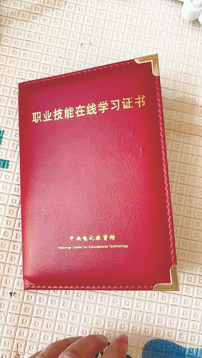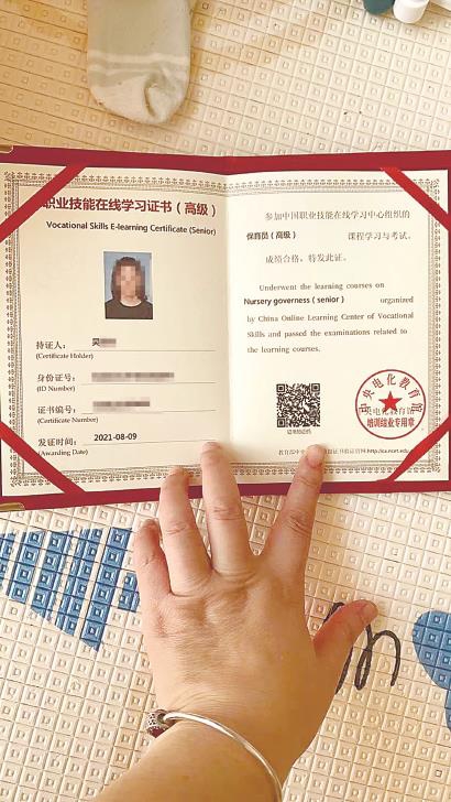 于是,陈女士缴纳2380元,报名参加了“保育员内部限额班”,通过近一个月的网课学习之后,收到了一本“职业技能在线学习证书”,“证书盖着公章,还写着是高级保育员,看着是很正规的样子。”